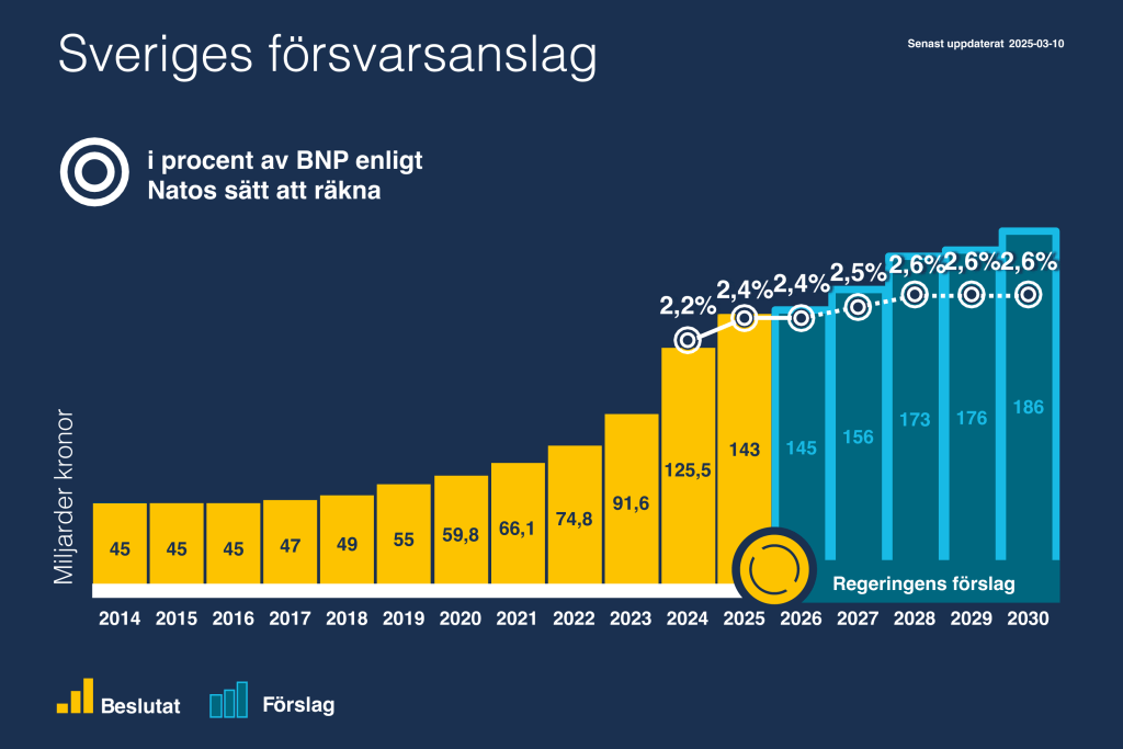 They want to borrow SEK 300 billion – US$ 30 bn – to finance Sweden’s future rearmament, which comes on top of a rearmament that saw Sweden spend SEK 45 billion on its ‘defence’ ten years ago and today spending SEK 143 billion, an increase of 318%. More details on the Government Chancellery page – showing this development: