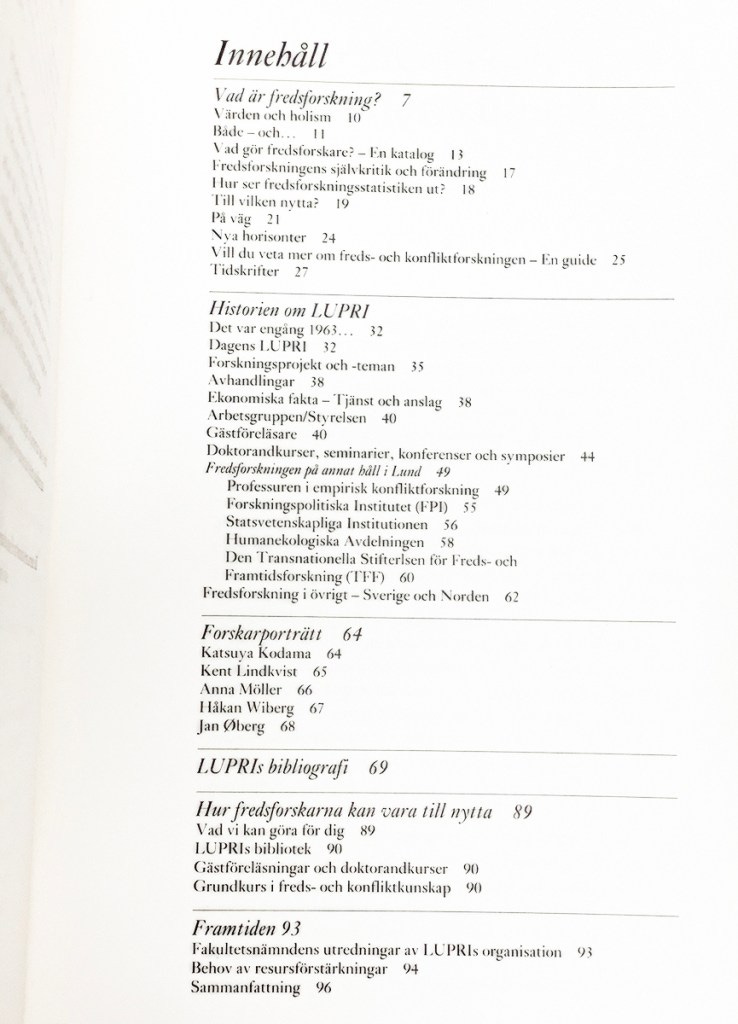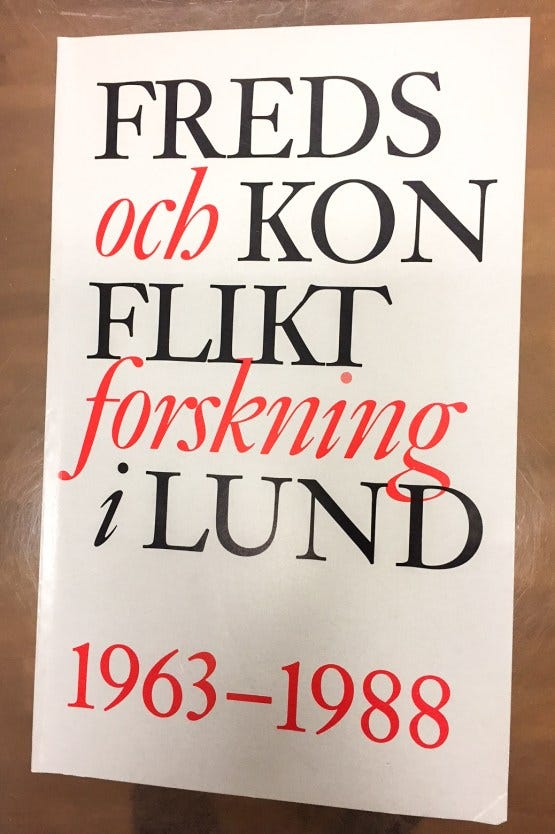 The 25 out of 26 years of peace research at Lund University is documented in the booklet ”Freds och Konfliktforskning i Lund 1963-1988” (96 pages) edited by me. Unfortunately, it is in Swedish and not available online. It explains the developments – research programs, courses and seminars in the field of peace and conflict in Lund – except the last year when it was all destroyed.